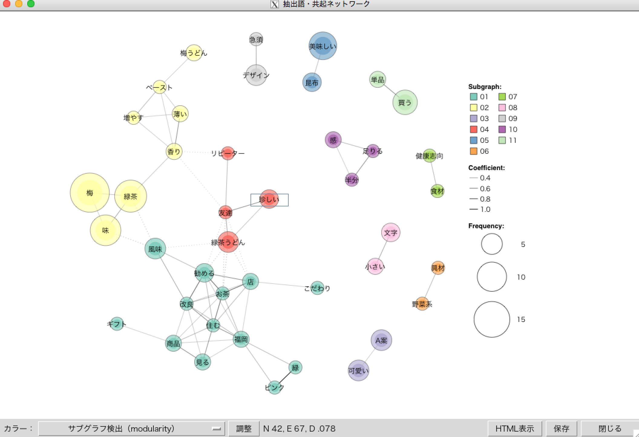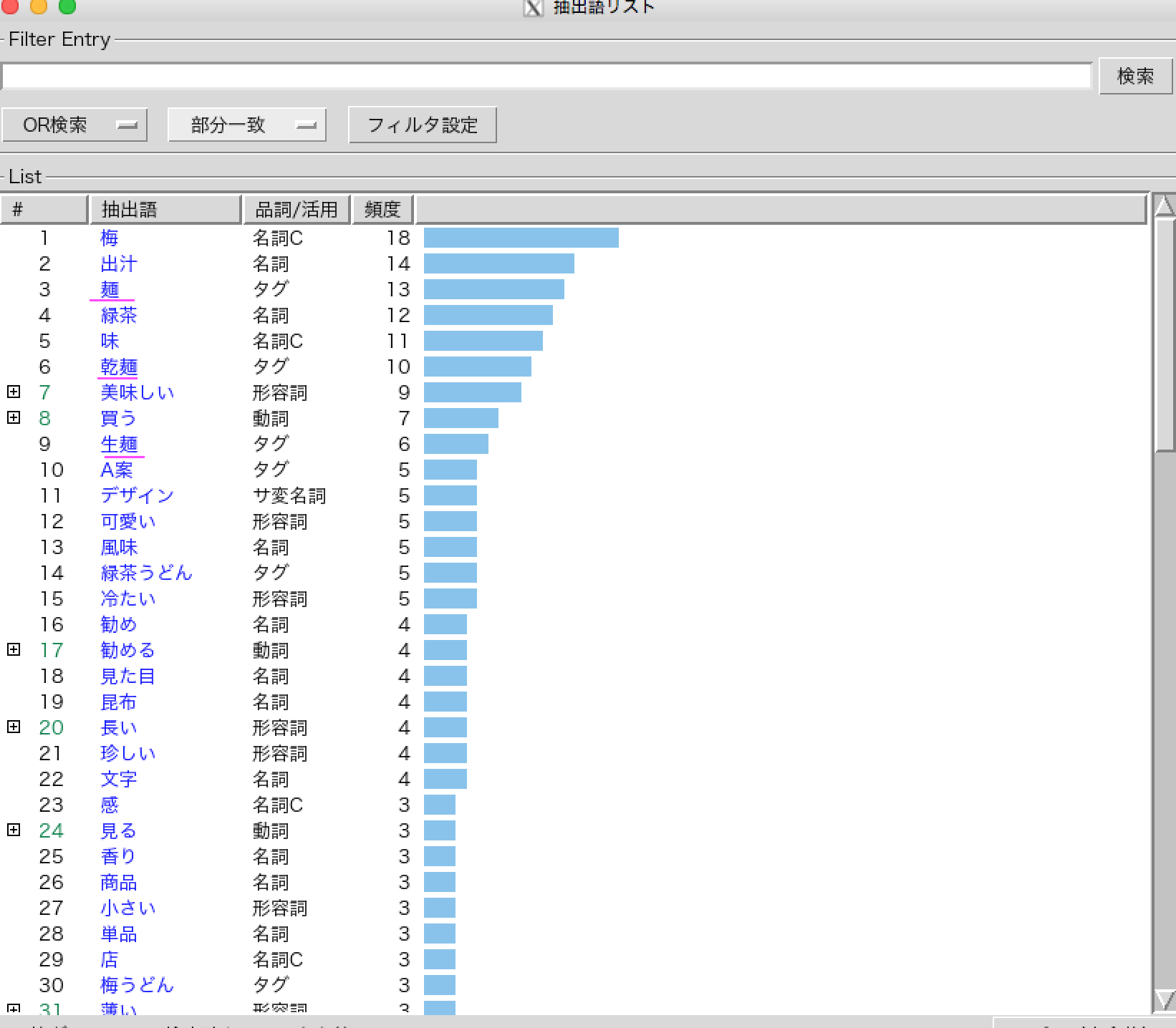 いつもお世話になります。■お使いのKH CoderのバージョンKH Coder 3■KH Coderのインストール先フォルダ(解凍先フォルダ)MacBook Proのデスクトップ上■どんなエラー・不具合・問題ですか?抽出語リストが、なぜか共起ネットワークにそのまま反映されず(必要な「麺」というワードが表示されず)添付写真のようになってしまいます。※写真は続けてアップします。■お使いのOSmacOS sierra 10,12,6